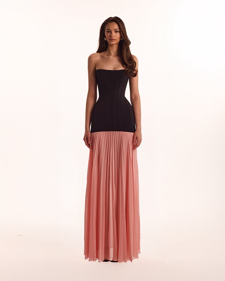 Образ складається зі стриманої чорної мінісукні без бретелей, яка ідеально облягає фігуру, створюючи виразний силует, та легкої рожевої плісированої максіспідниці, що додає руху та контрасту.