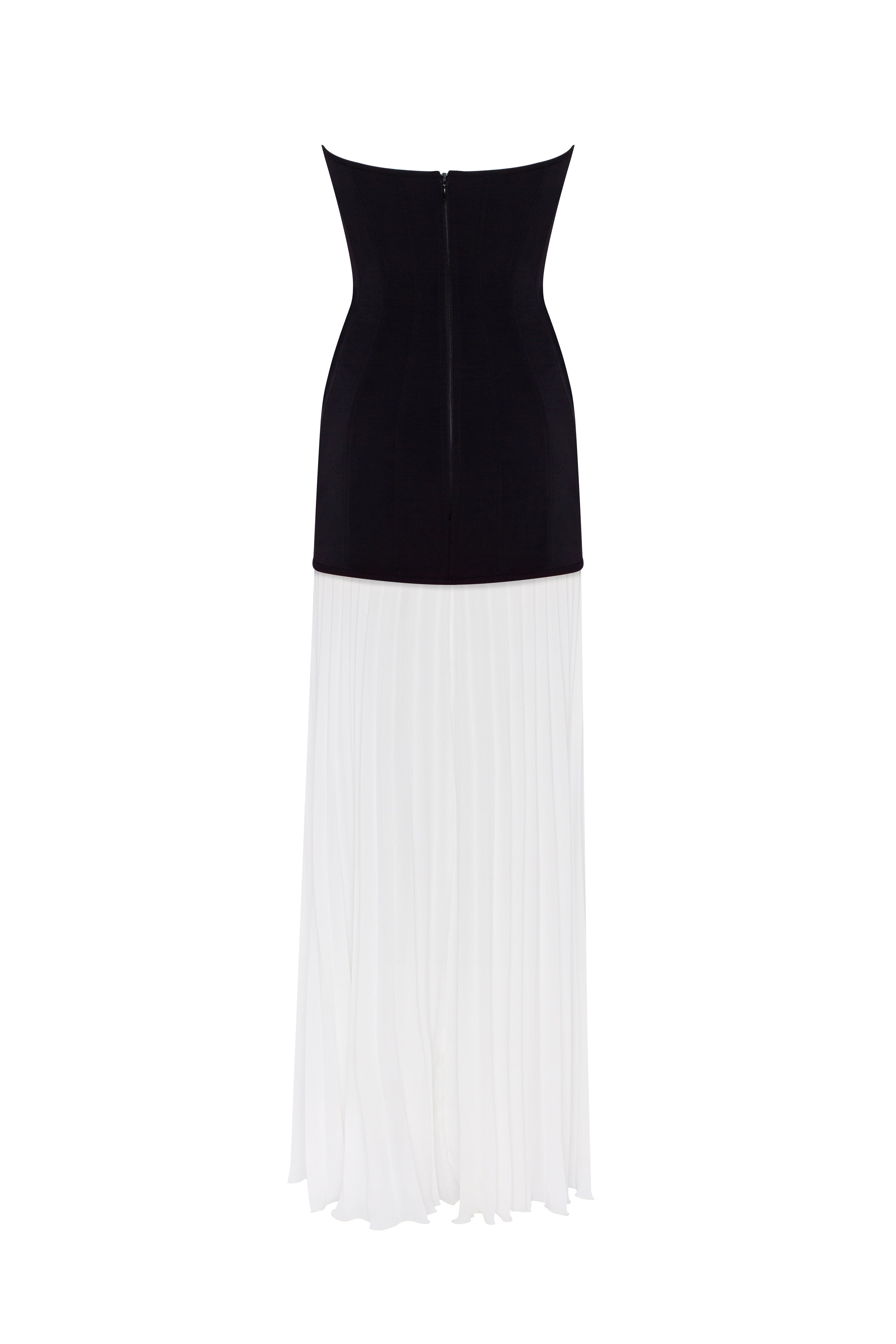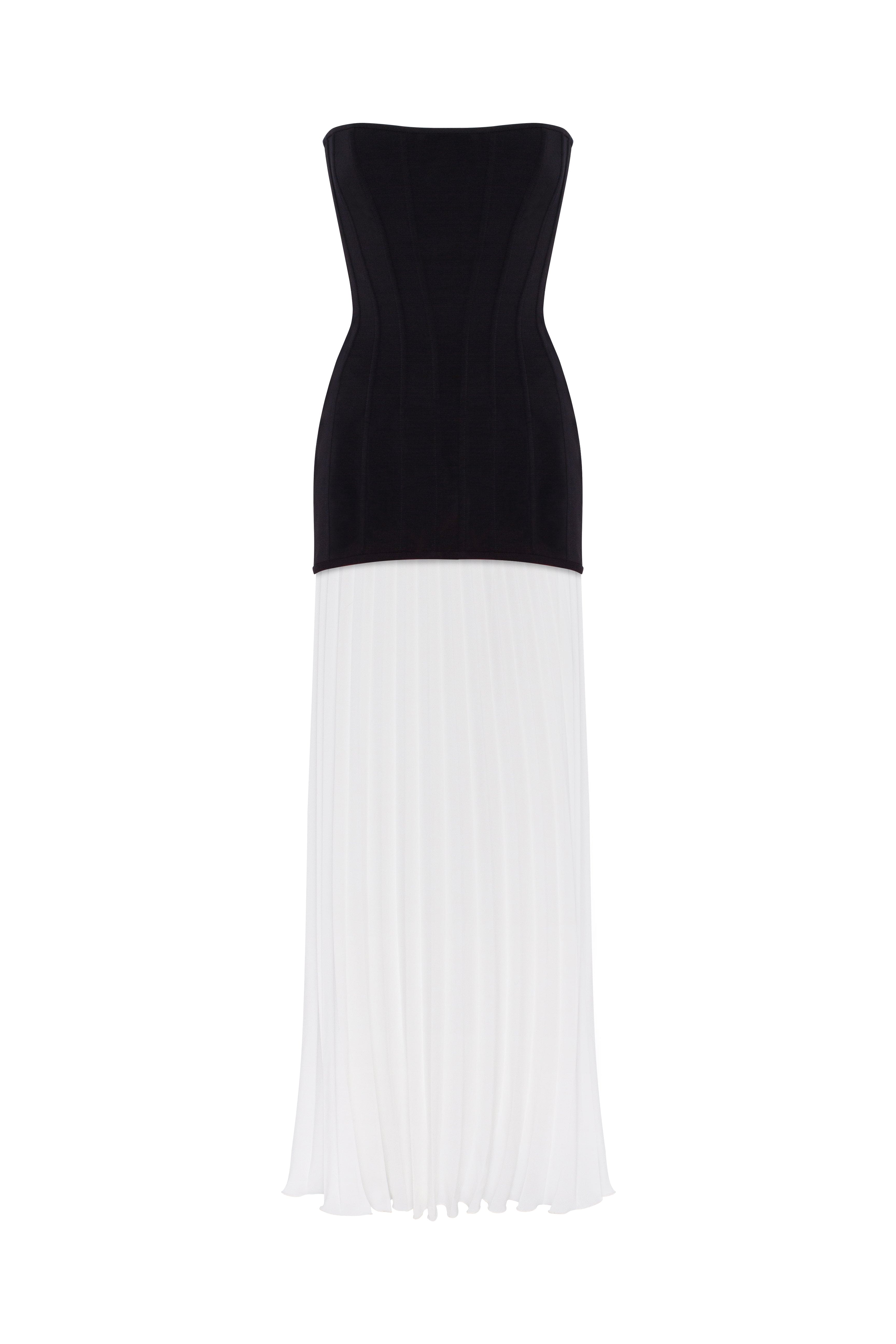 Образ складається зі стриманої чорної мінісукні без бретелей, яка ідеально облягає фігуру, створюючи виразний силует, та легкої білої плісированої максіспідниці, що додає руху та контрасту.