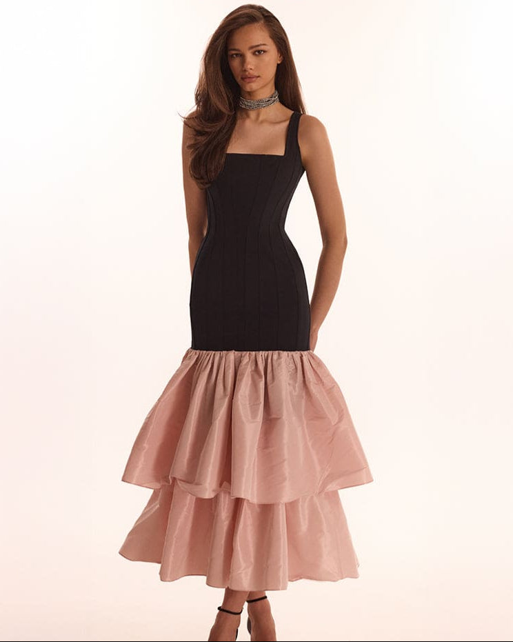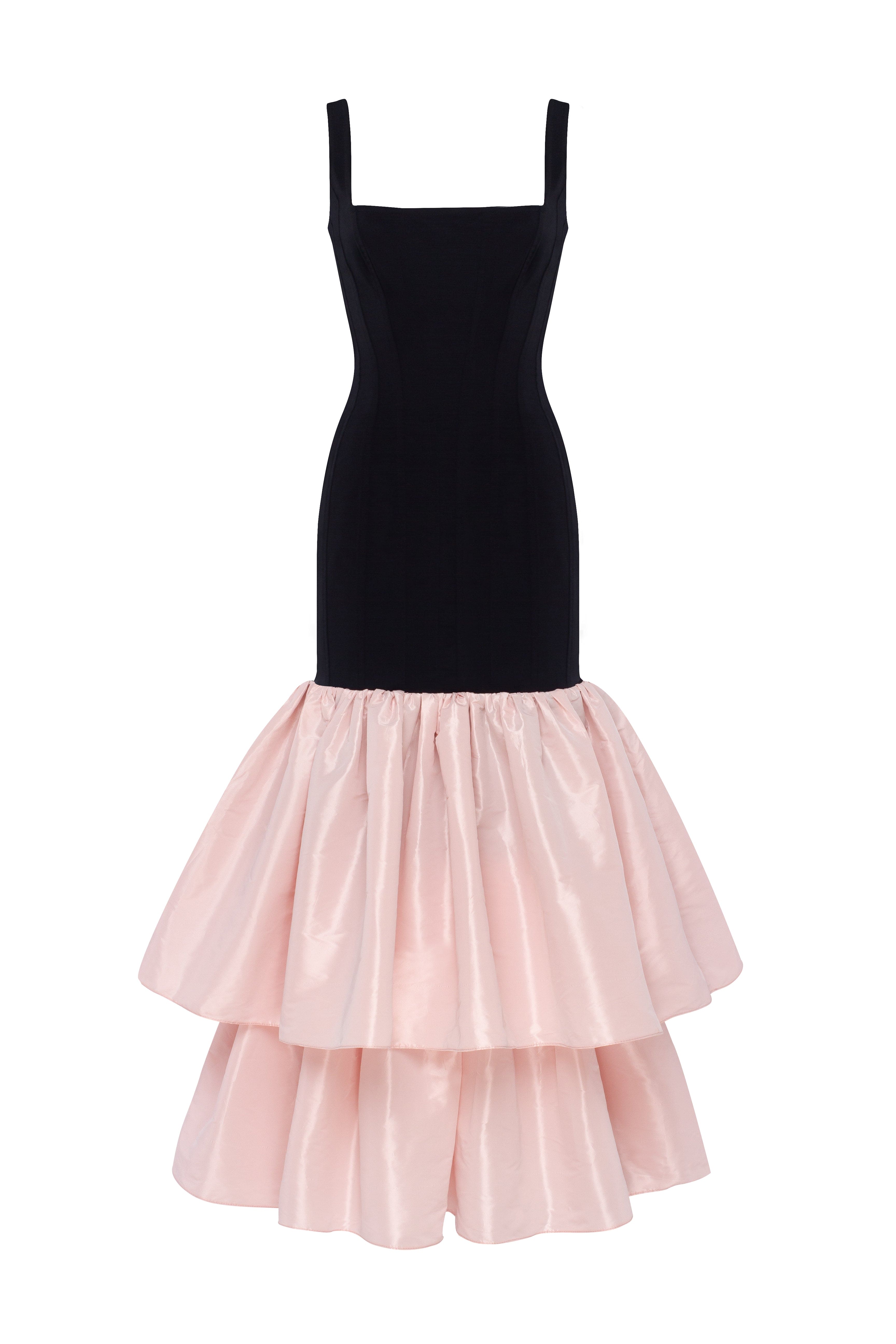 Елегантна приталена сукня силуету «русалка» з квадратним вирізом і широкими бретелями. У контрасті до лаконічного чорного верху — об’ємна, пишна спідниця з рожевої тафти, що спадає драматичними ярусами, додаючи руху та нотку романтичності. Знімний нижній волан дозволяє трансформувати сукню з максі у міді, даруючи свободу стилізації для різних подій.