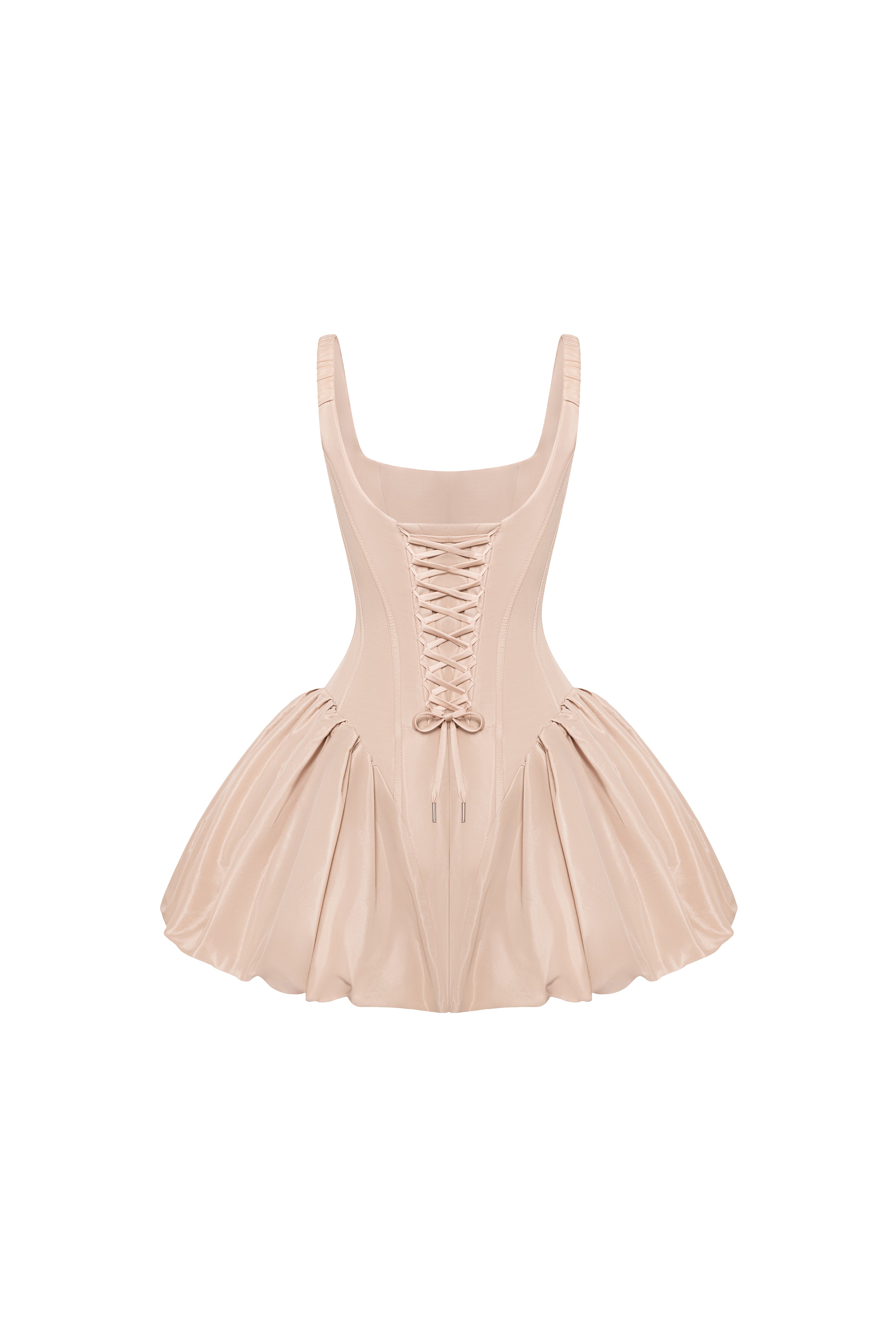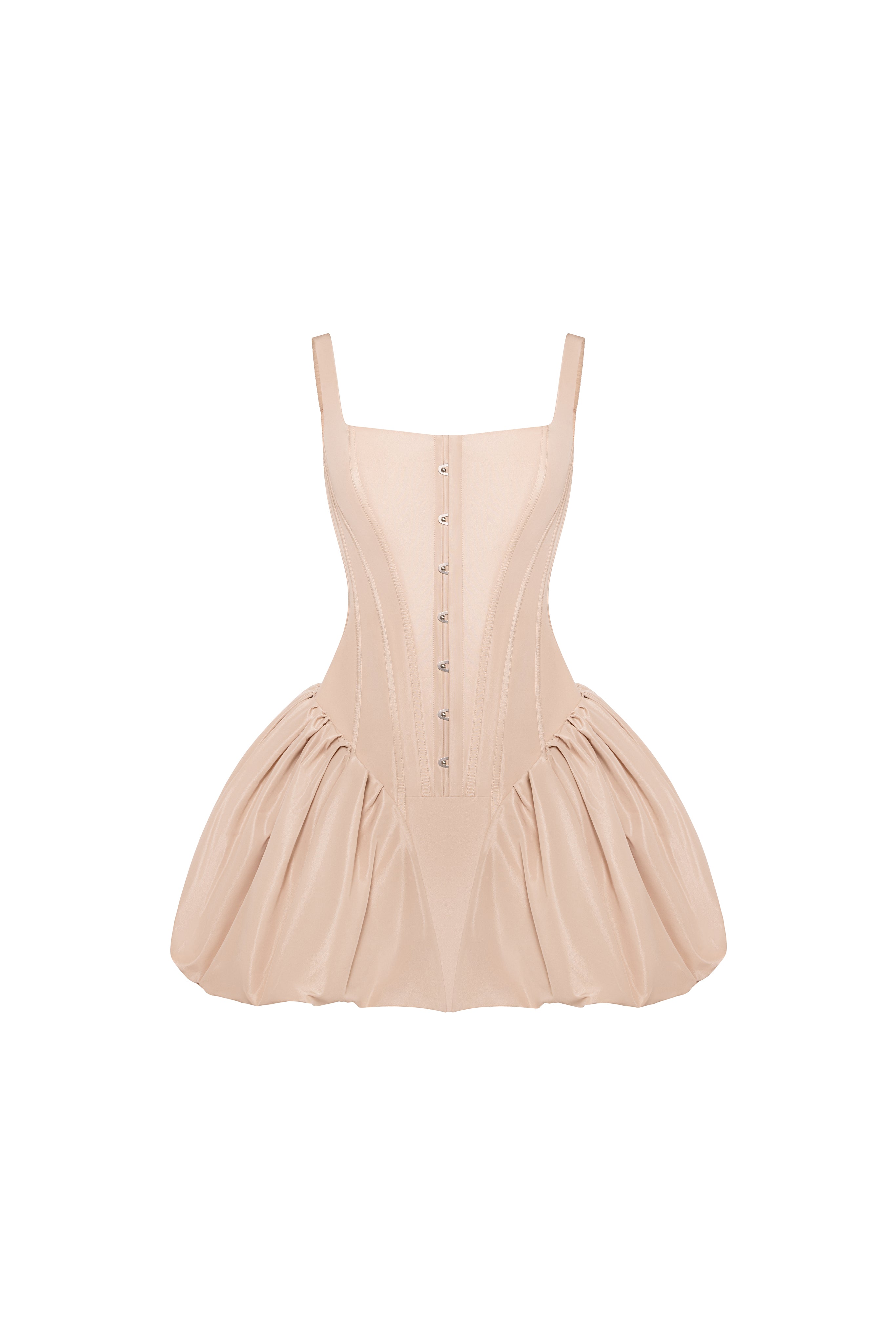 Корсетна мінісукня у бежевому відтінку. Скульптурний силует із заниженою талією поєднується з об’ємною повітряною спідницею, підкреслюючи жіночність та додаючи образу сучасної грайливості. Корсет на шнурівці зі стриманим прямим вирізом і бретелями підкреслює талію та забезпечує надійну підтримку будь-якого типу бюсту. Універсальний крій гарантує ідеальну посадку незалежно від фігури чи зросту.