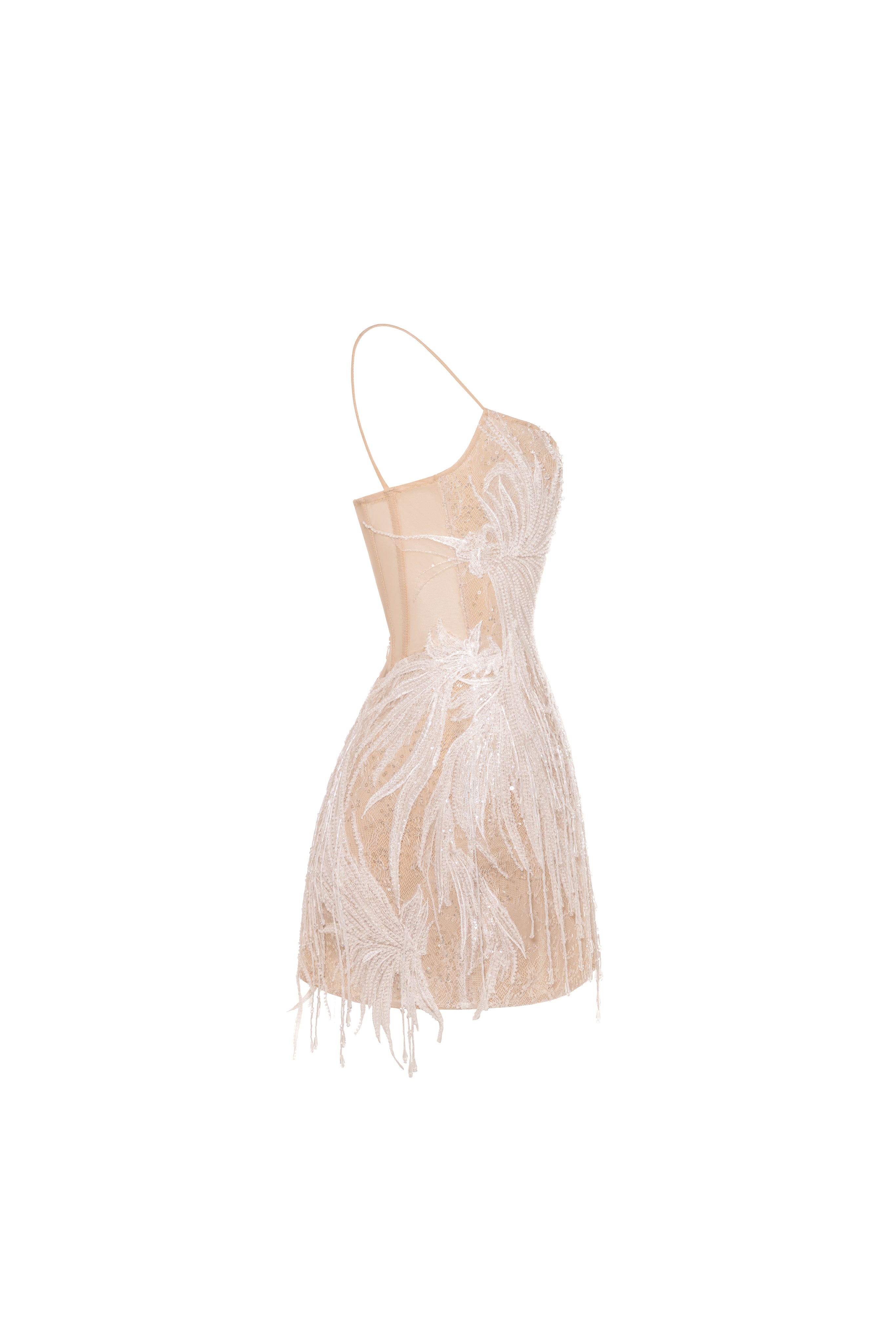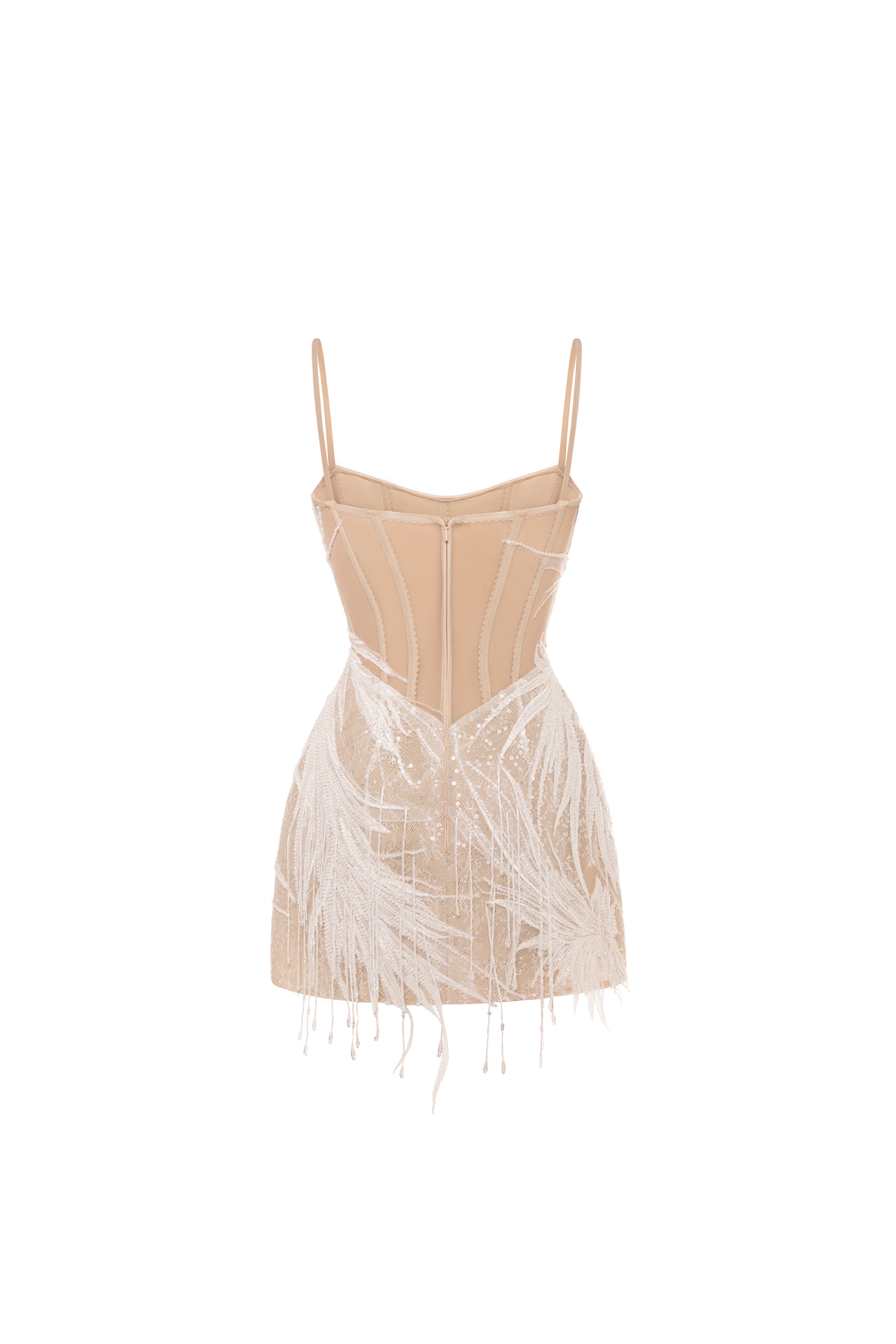 Зваблива бежева мереживна мінісукня, вручну оздоблена мерехтливим візерунком із леліток та китицями з бісеру, що надають образу грайливості та естетики гламурних 1920-х. Облягаючий крій візуально робить силует стрункішим, не обмежуючи рухів, а корсетний ліф на тонких бретелях акцентує зону декольте.