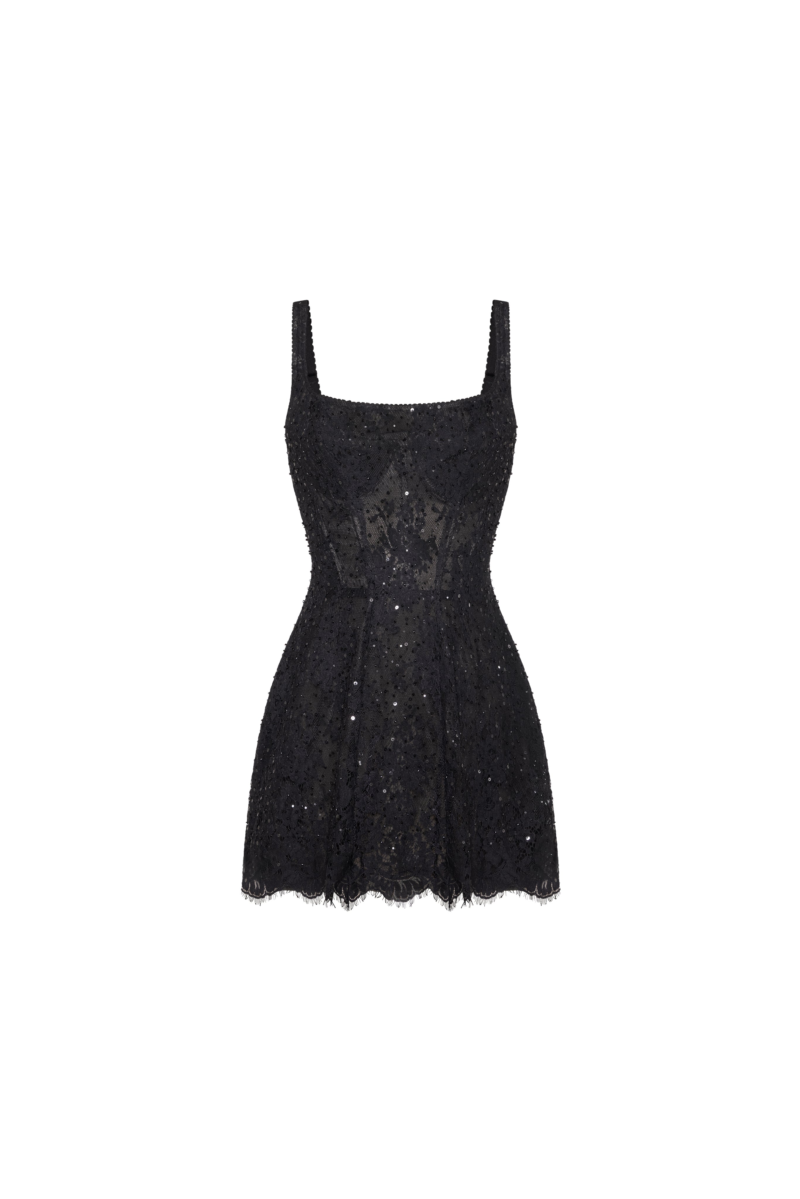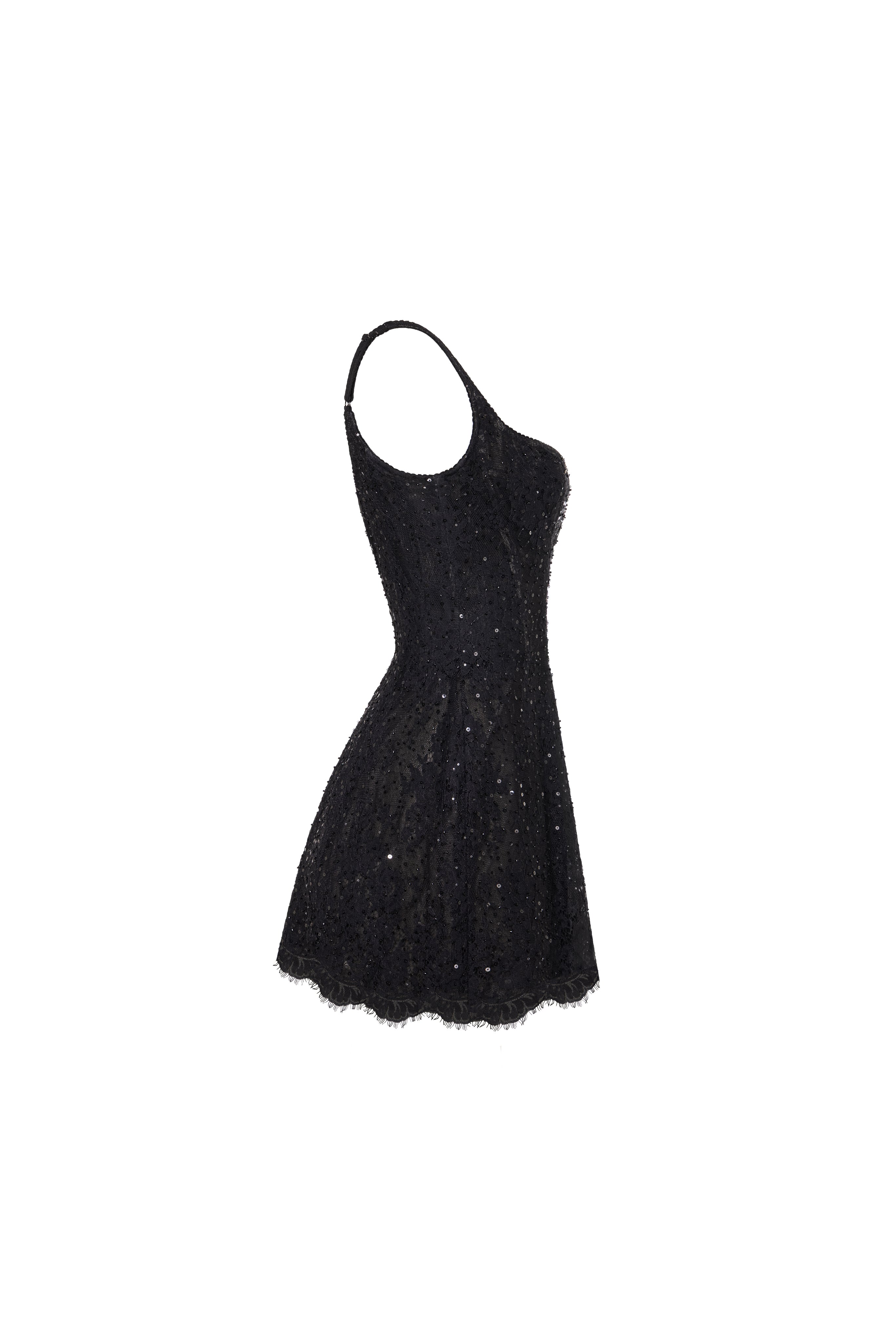 Класична приталена мінісукня, що має бути в гардеробі кожної жінки. Структурований ліф з широкими бретелями формує бездоганну посадку, а силует м’яко огортає фігуру та адаптується до різних пропорцій. Сукня вручну оздоблена лелітками, що додають делікатного мерехтіння у світлі, а мереживна оборка по краю спідниці надає образу ніжності й романтики. Навіть при активному русі спідниця міні залишається на місці — завдяки вшитому підспідничнику, що дарує комфорт і легкість.