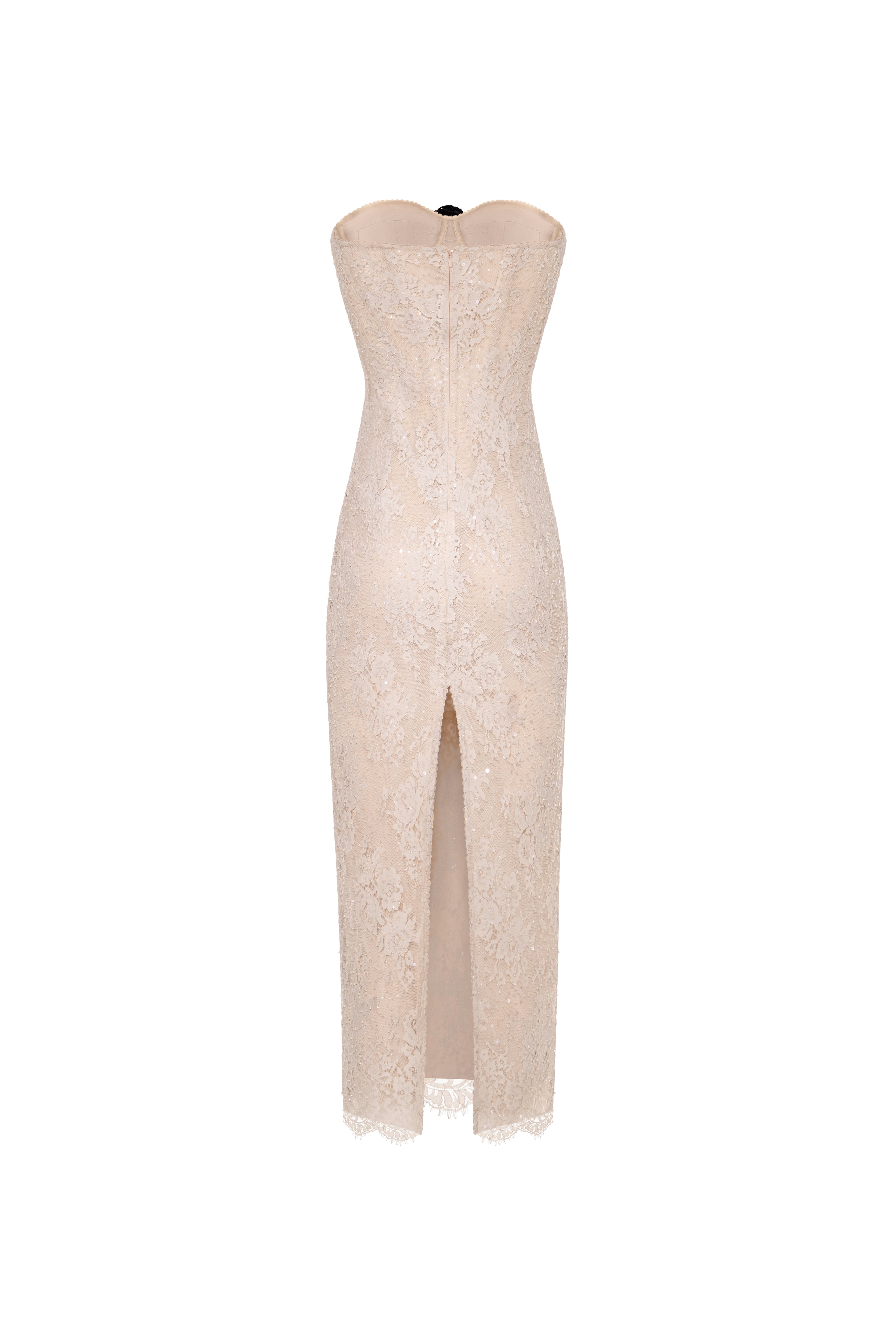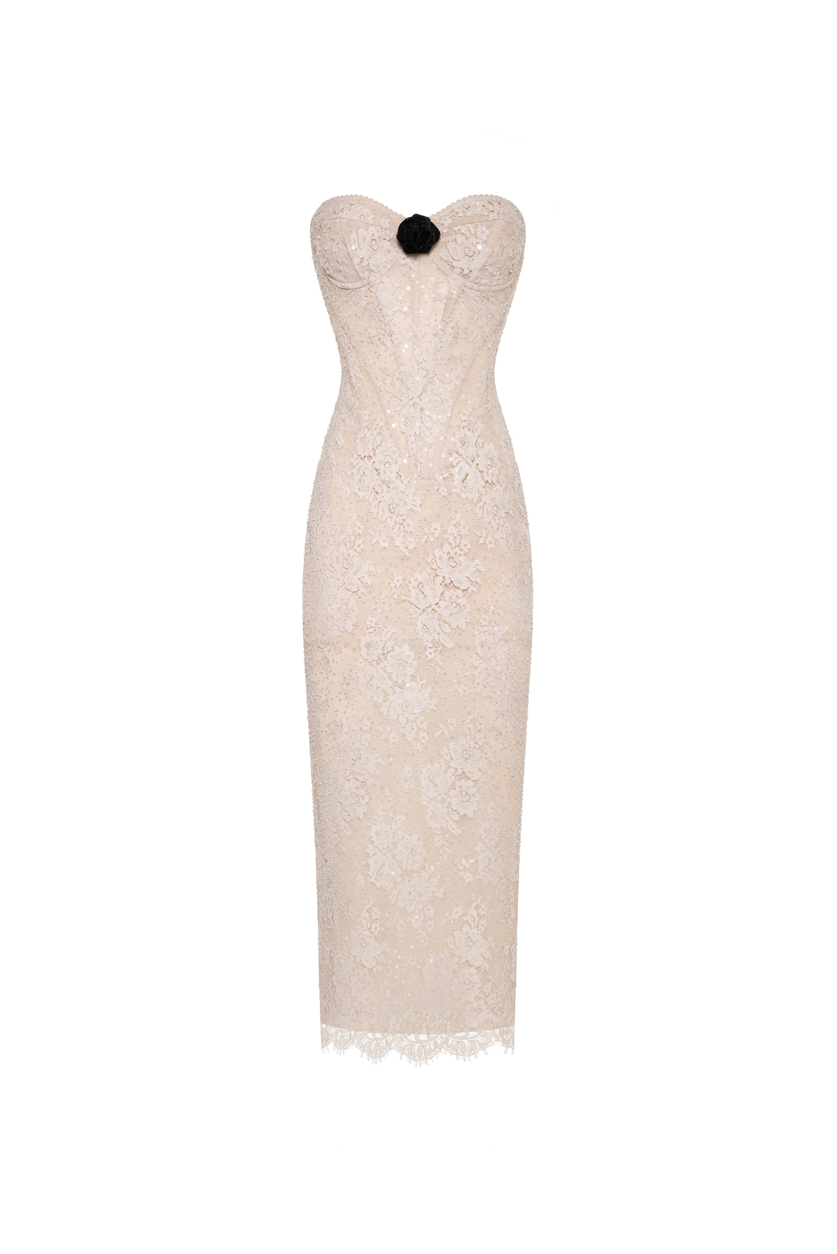 Максісукня у нюдовому відтінку, створена з мережива шантильї, що делікатно облягає фігуру. Мереживо, вручну оздоблене лелітками, делікатно мерехтить, а центр бюсту прикрашає знімна чорна квітка, що додає контрасту та універсальності образу. Розріз по центру спідниці ззаду дарує свободу рухів попри облягаючий звабливий силует.