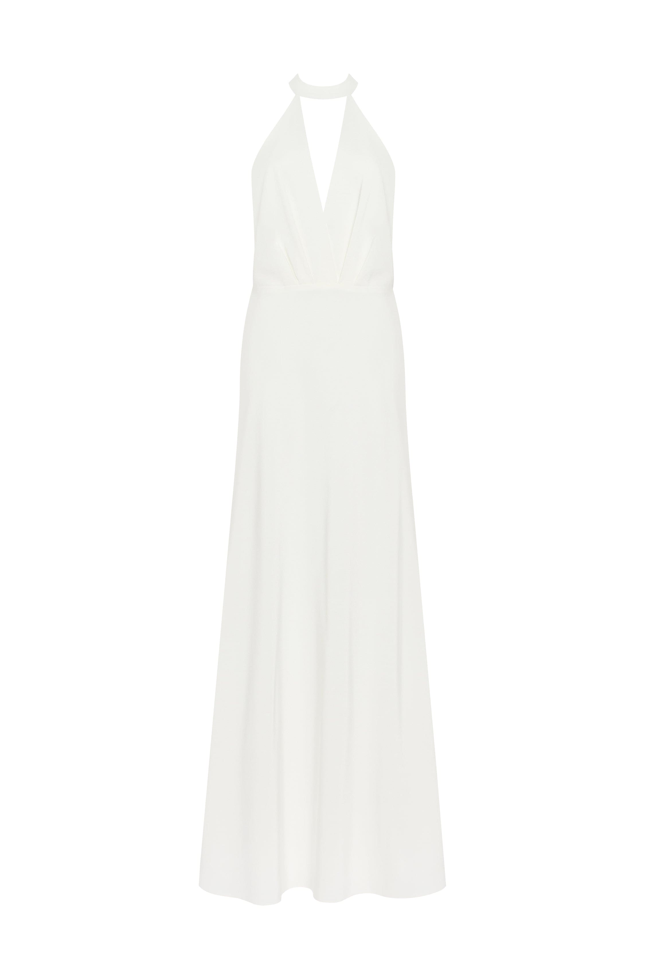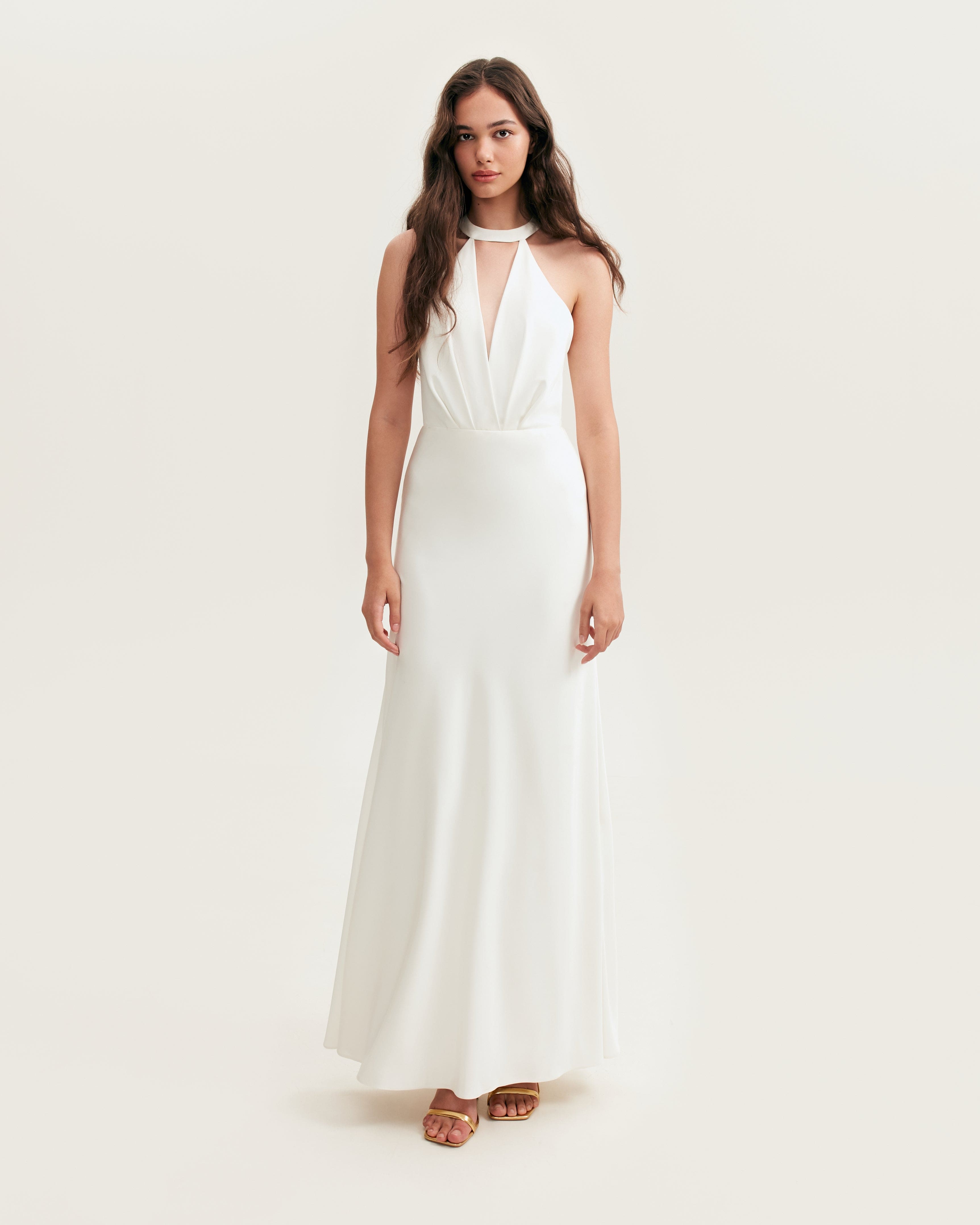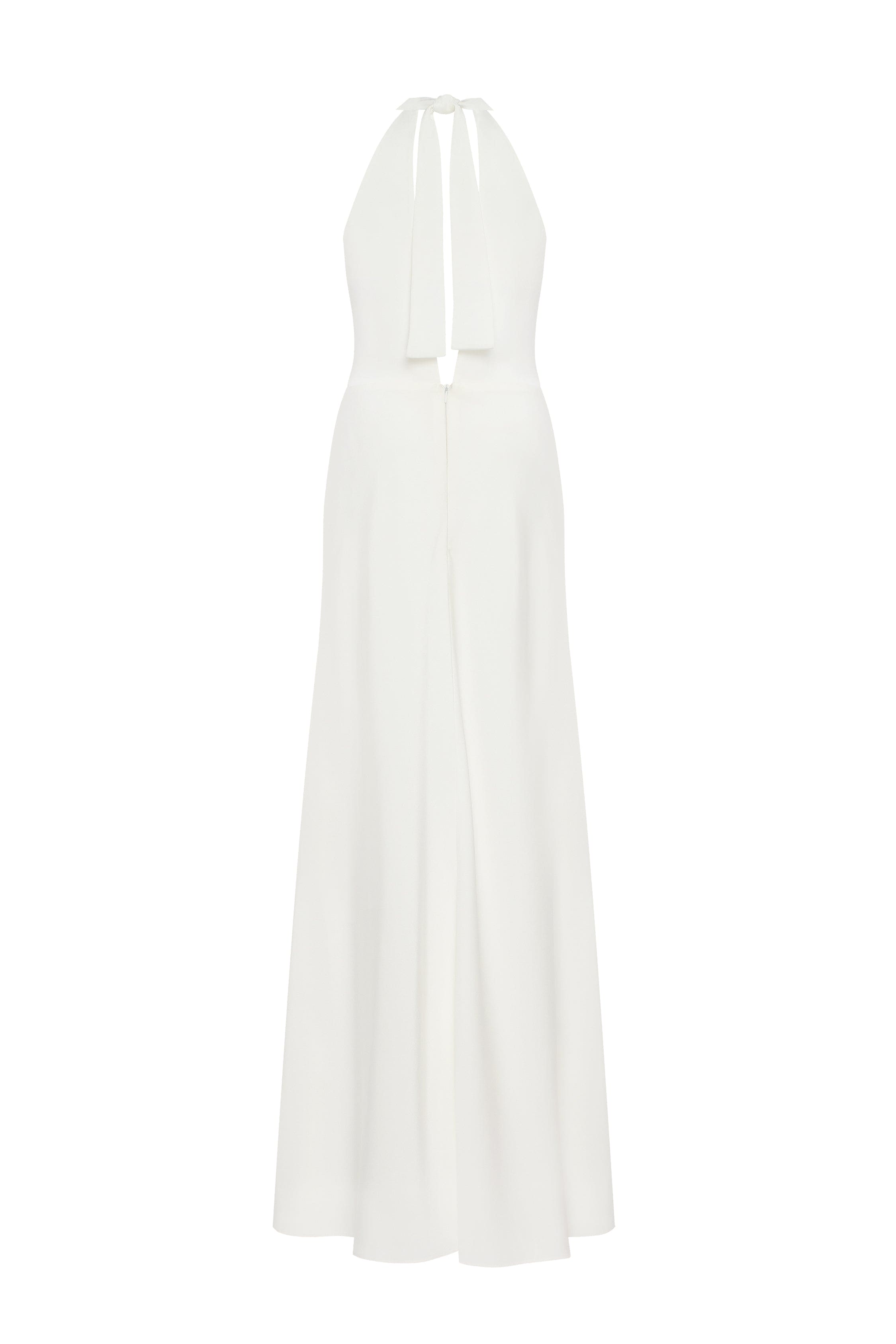 Біла приталена максісукня з зав'язкою на шиї і глибоким декольте