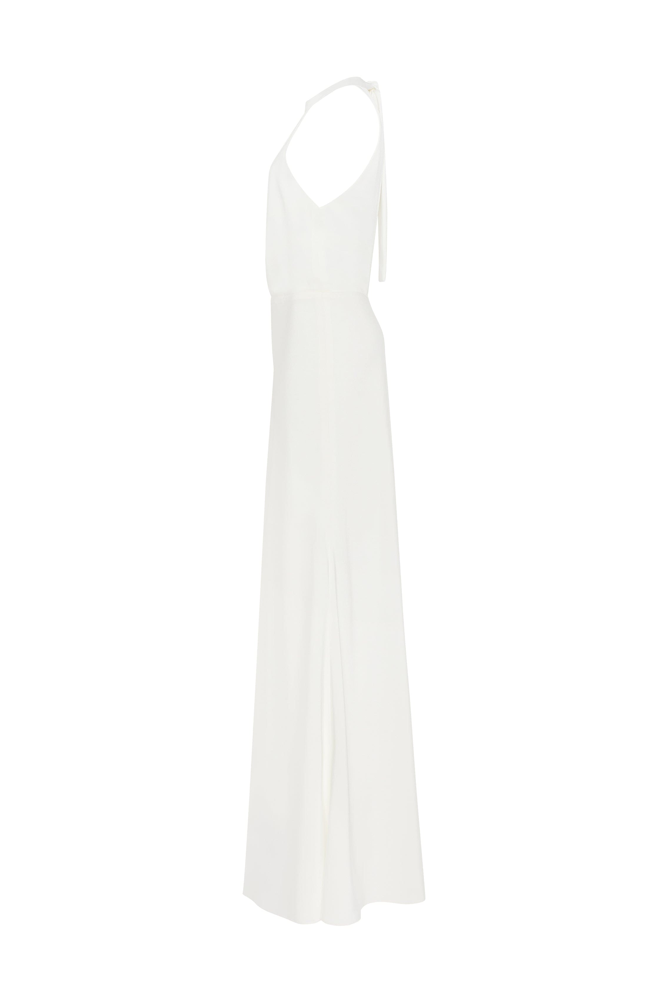 Вишукана максісукня з білого італійського атласу з приталеним силуетом прямого крою. Має глибоке V-подібне декольте, зав’язки за шию, драпірований ліф та плавний прямий крій. Відкрита спина з V-подібним вирізом створює виразний акцент. Ідеальний вибір для розкішних вечорів та урочистих подій.