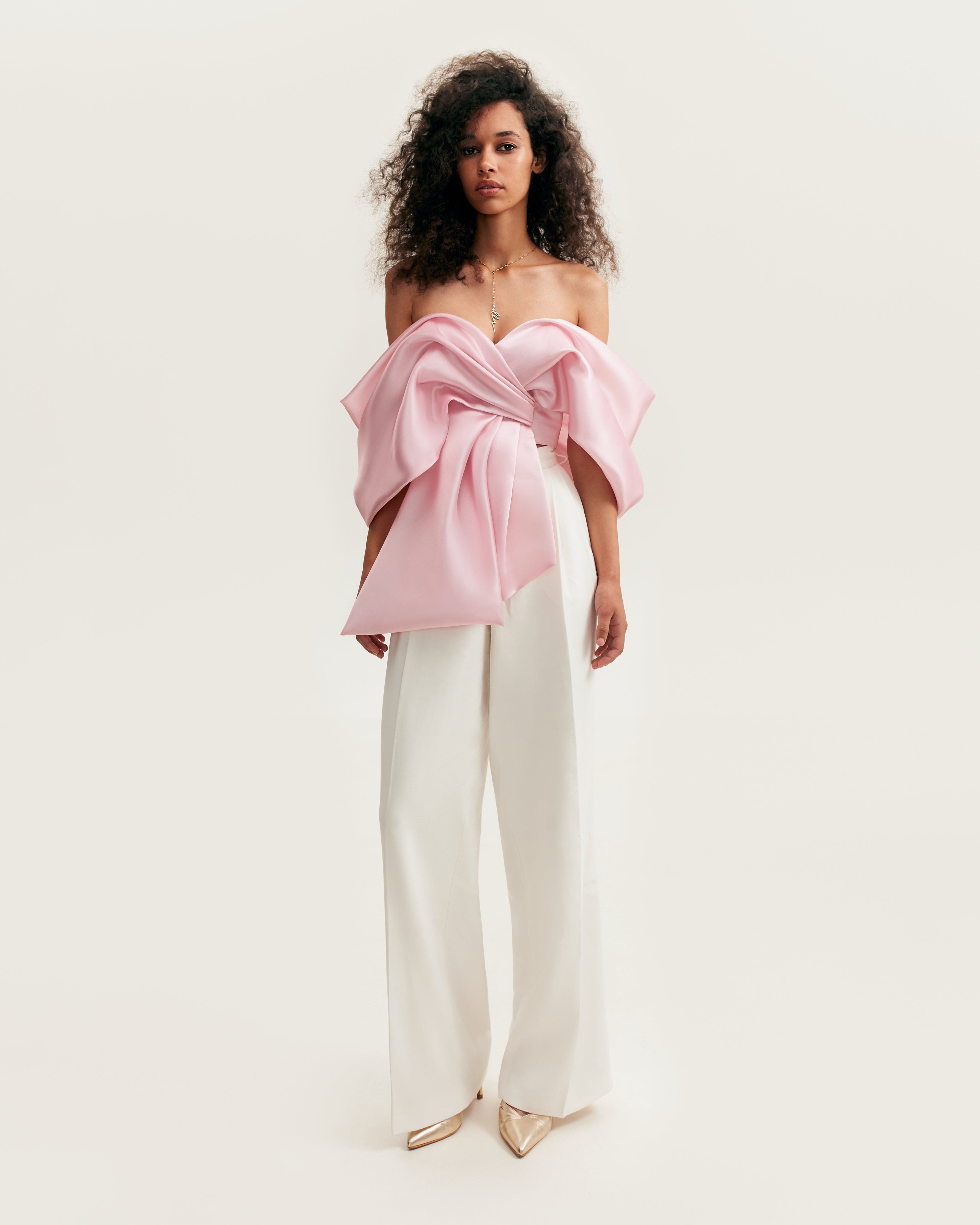Рожева блуза з відкритими плечима з органзи та декоративним бантом